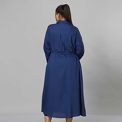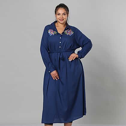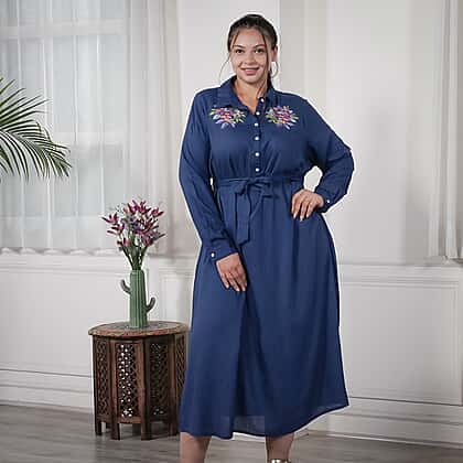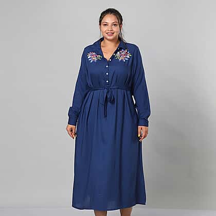 JOVIE 100% Viscose Floral Embroidered Long Dress with Belt in Blue (Length- 125cm, Bust- 116cm) (Size 18-22)