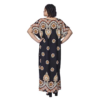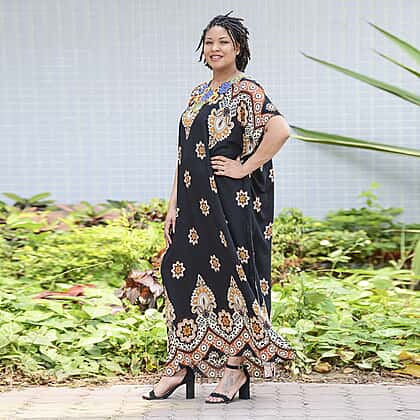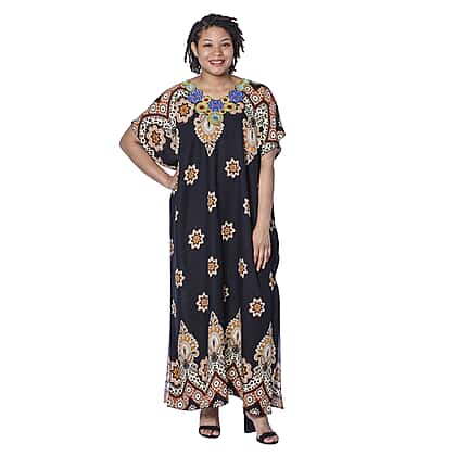 JOVIE Black Bohemian Style Printed Long Dress with Embroidered Neckline ( Up to Size 20 ) CB 54in