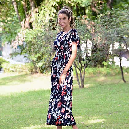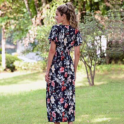 JOVIE Floral Pattern Smocked Waist Maxi Dress with Flutter Sleeve - Navy and Red