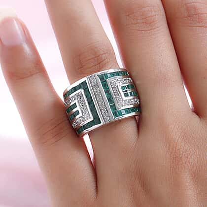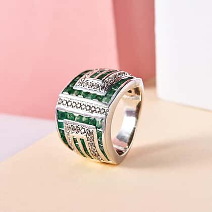 Kagem Zambian Emerald and Natural Zircon Ring in Platinum Overlay Sterling Silver 3.89 Ct, Silver Wt. 10.00 Gms.