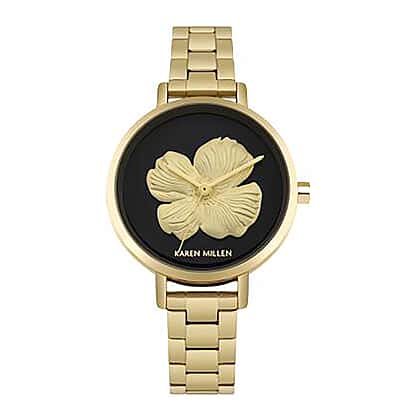 Karen Millen Bracelet Watch with 3D Gold Tone Flower on Black Dial