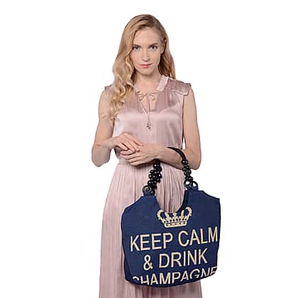 Keep Calm Quote Pattern Jute Handbag (38x11x29cm) - Navy
