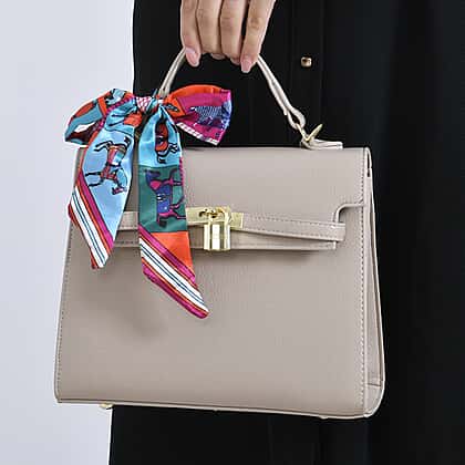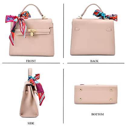 Kelly-Style Shoulder Bag with Scarf Accent & Adjustable Strap - Beige