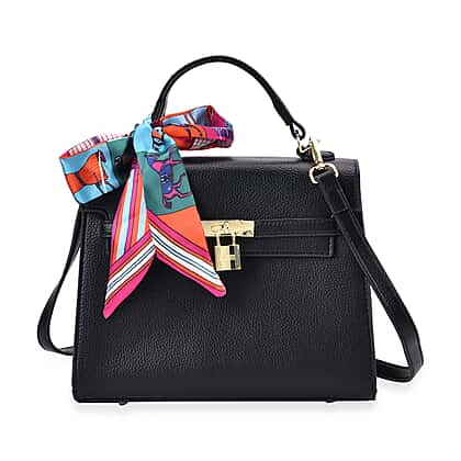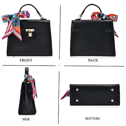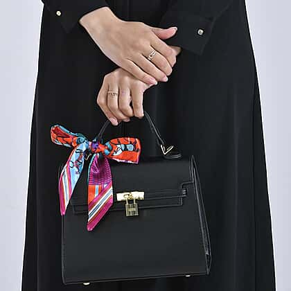 Kelly-Style Shoulder Bag with Scarf Accent & Adjustable Strap - Black