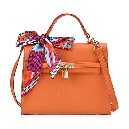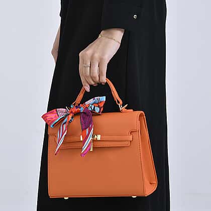 Kelly-Style Shoulder Bag with Scarf Accent & Adjustable Strap - Orange