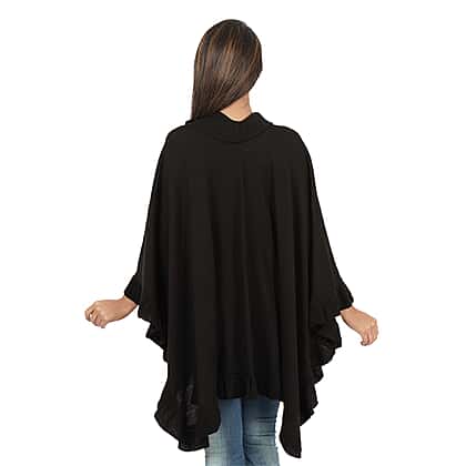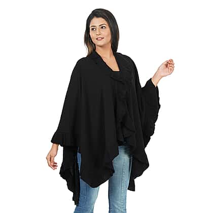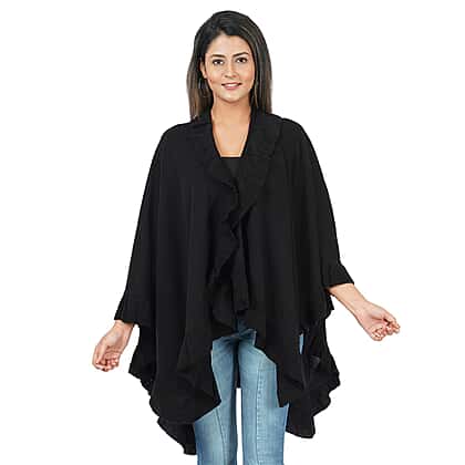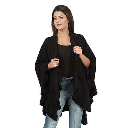 Knit Kimono with Frilled Hemline (L: 150cm, W: 140cm) - Black