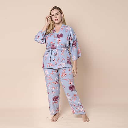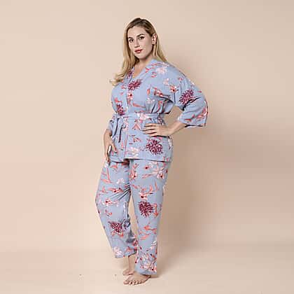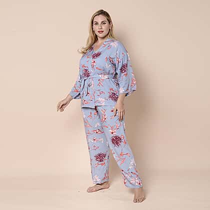 LA MAREY 100% Viscose 3 Piece Red Floral Pattern on Blue Sleepwear Set - Inclds Camisole Top, Elasticated Trousers and Belted Kimono (Size up to 16)