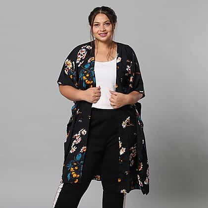 Multi Colour Floral Print Bohemian Look Long Kimono in Black (Size up to 22)