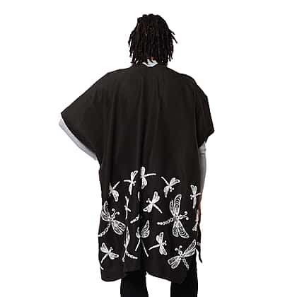 New Arrival Short Sleeve Black Kimono with White Drangonfly Embroidered (Size 90x95cm)