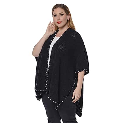 Solid Black Colour Ruana Shawl with Pearl Trim