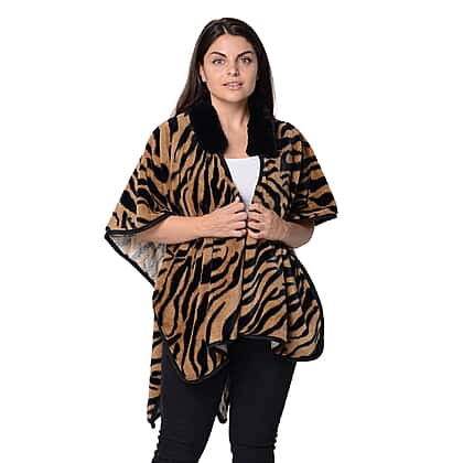 Tiger Pattern Winter Kimono with Faux Fur Collar (Size 79x99 Cm) - Brown and Black