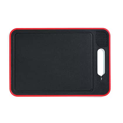 4-in-1 Multi-Purpose Defrosting Cutting Board - Defrosts upto 8 Times Faster, Knife Sharpener & Garlic Grater - Black & Red