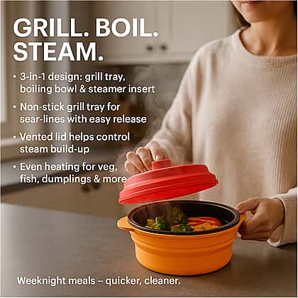 Steam smarter with the collapsible silicone food steamer with non-stick grill tray in orange and red, designed for quick, healthy meals straight from the microwave. This vibrant and space-saving set includes a flexible silicone pot, non-stick baking tray, and a silicone steaming plate—ideal for everything from vegetables to fish. Its collapsible body makes storage a breeze (22.5x26x6cm), while the built-in handles ensure safe and easy handling. The non-stick surface allows for fuss-free cleaning, and the compact yet functional design makes it perfect for home kitchens, offices, or even travel. It’s a convenient, colourful upgrade to everyday cooking and meal prep.