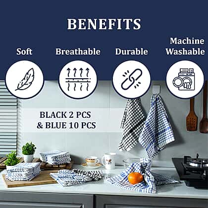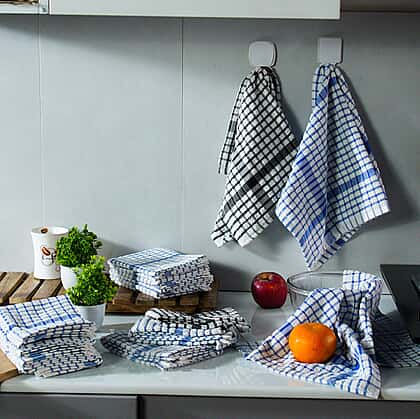 Introducing the ultimate kitchen essential, the Set of 12 heavy-duty cotton checkered kitchen towels! Made from 100% premium quality cotton, these towels are stylish with their classic checkered pattern and are highly durable and absorbent. Perfect for all your kitchen needs, from wiping spills and cleaning surfaces to drying dishes and hands, these towels are a must-have for any home cook or professional chef. The thick and heavy-duty construction ensures they can handle even the toughest messes, while the soft and gentle touch ensures they won't scratch delicate surfaces. So upgrade your kitchen game with this set of 12 towels that will last you for years!