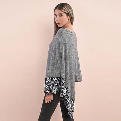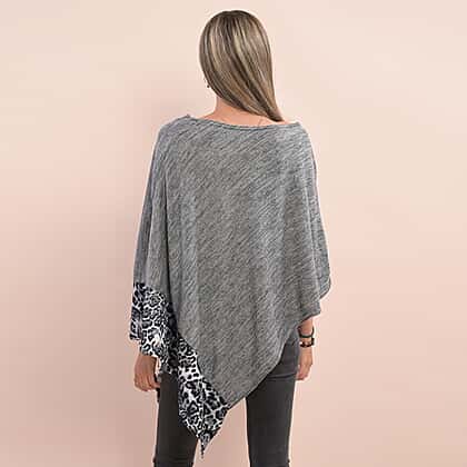 Knitted Poncho with Leopard Print Border (Size 75x80 Cm) - Grey