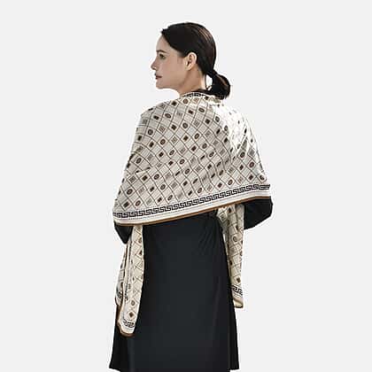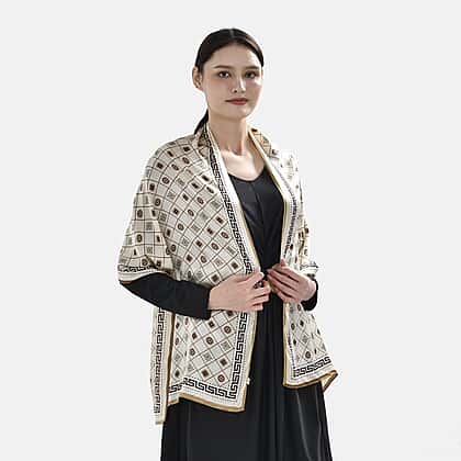 La Marey 100% Silk Greek Key Printed Scarf (Size 170x52 cm) - Champagne & Brown