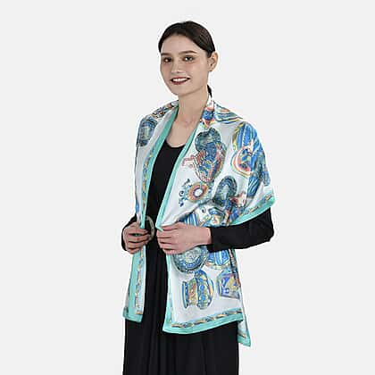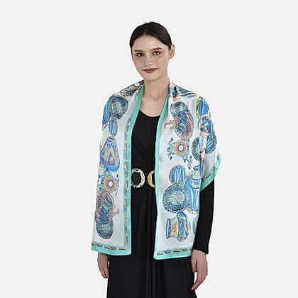 La Marey 100% Silk Vase Design Printed Scarf (Size 170x52 cm) - Green & Blue
