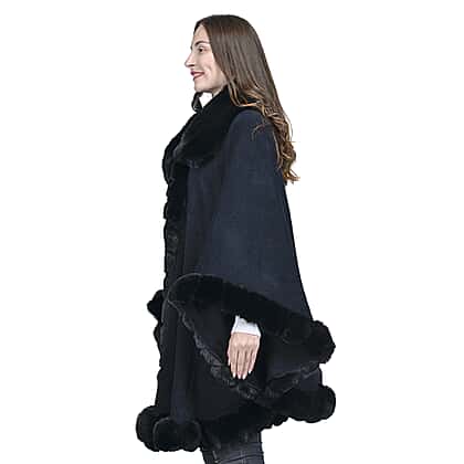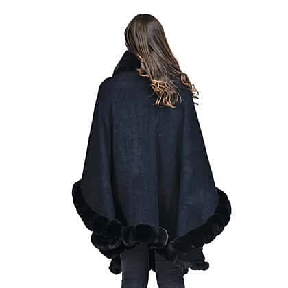 LA MAREY Faux Fur Trim Poncho (One Size) - Black