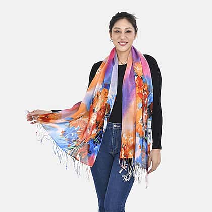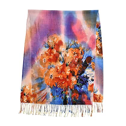 LA MAREY Floral Pattern 100% Merino Woolen Scarf (Size 175x65 cm) - Orange - Multi