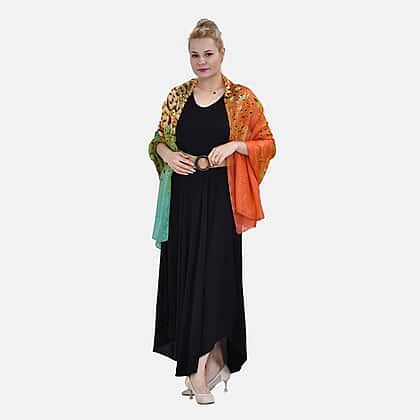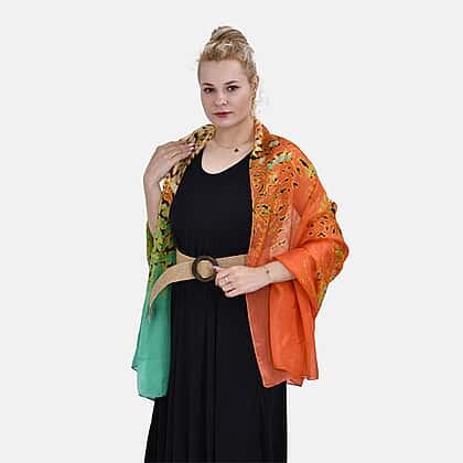 LA MAREY Floral Printed 100% Mulberry Silk Scarf (Size 180x110 cm) - Green - Orange
