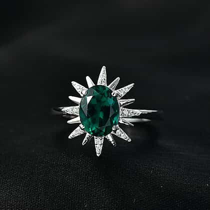 LUXURIANT Lab Grown Emerald, White Zircon Starburst Ring in Rhodium Overlay Sterling Silver 1.75 Ct.