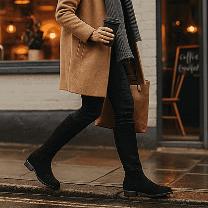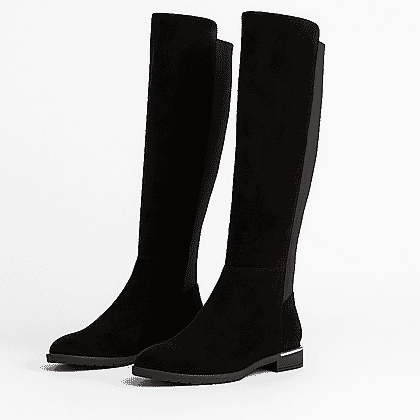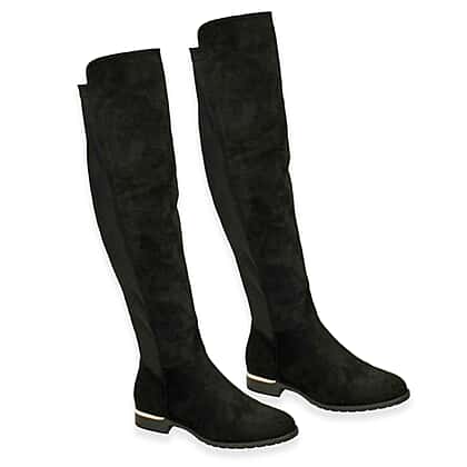 Step out in style with these elegant over-the-knee microsuede boots, designed for both comfort and sophistication. Crafted with a stretch microfibre Lycra upper, they offer a snug yet flexible fit that flatters the leg beautifully. The faux fur lining keeps you warm and cosy, while the subtle golden trim at the heel adds a touch of glamour. Complete with a practical side zip for easy wear, these wide-fit boots are perfect for pairing with skirts, dresses, or skinny jeans for an effortlessly chic look.