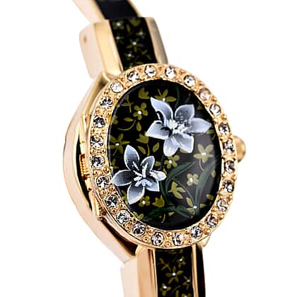 The sleek and modern touch of the gold and white floral pattern ladies bangle watch comes with the lid and pairs beautifully with the feminine and delicate rose accents that dance across the watch's cover. This is the perfect accessory for you if you are a woman with an appreciation for style and a diverse range of fashion. It is made from a durable frame with 18K rose gold that hides the perfectly painted white and black face underneath it. A beautiful and unique floral engagement for your wrist.