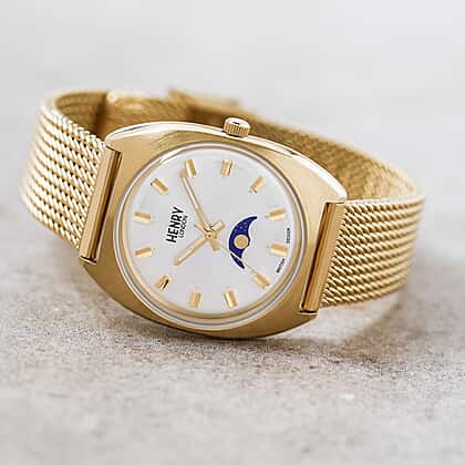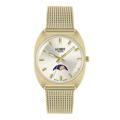 Henry London Moonphase Square Round Ladies White Silver Dial 3 ATM Water Resistant Watch with Gold Colour Mesh Bracelet