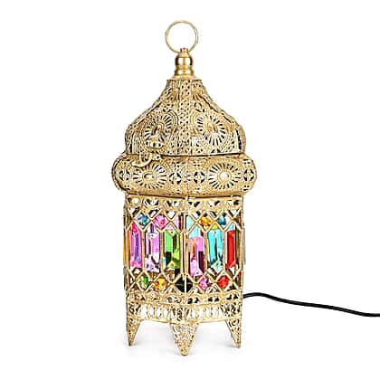 Add warmth and character to your home with this stunning Moroccan Table Lamp, beautifully crafted to bring a touch of exotic charm to any space. Measuring 40x21x19cm and weighing just 860g, this lamp features an ornate iron frame with plastic detailing, finished in a vibrant multicolour palette that casts enchanting patterns when lit. The design showcases traditional Moroccan craftsmanship, creating a statement piece perfect for side tables, consoles, or bedside corners. Fitted with a BS plug and compatible with an E14 bulb (included), it’s ready to brighten your room in style while blending function and artistry effortlessly.
