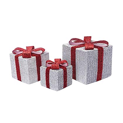 Set of 3 Gift Box Silhouette with 40 Warm LED Lights and Tinsel Decoration Set