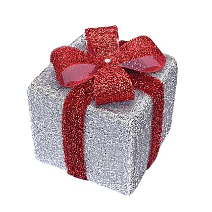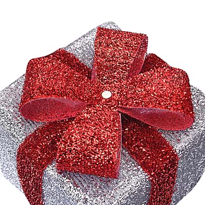 This festive set of three white tinsel gift boxes with a hook and loop fastener ribbon and 40 warm white LED lights will be ideal for your Christmas decorations. Each present is wire-connected, allowing you to arrange them in various ways. The gifts are battery-operated lead wires that can be placed throughout your home and are only suitable for indoor use.