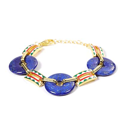 Lapis Lazuli Donut Shape Linked Bracelet (Size 7 with 1 inch Extender) in Stainless Steel