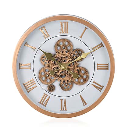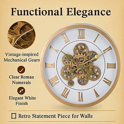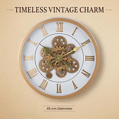 Large Vintage Turning Gears Wall Clock with Large Roman Numerals, Distinctive Retro Design (Size 45 cm) - White Plain
