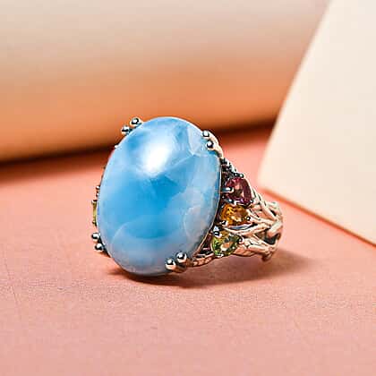 Allure your fingers with the exclusive charm of this larimar and tourmaline ring. In this ring, the exotic sea blue hues of the larimar can be perfectly seen with the oval cabochon cut. The pear faceted cut multi-colour tourmalines are pronged in a trilogy on each shoulder. The master artwork of the split shank ring is crafted in solid sterling silver. If you love big-sized gemstone jewellery, this larimar and the multi-tourmaline ring must be in your collection.