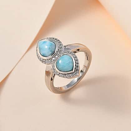 This ring crafted in Platinum Overlay Sterling Silver, cradles two Larimar stones mirroring each other in a teardrop and heart silhouette. The teardrop and heart designs, complemented by the sparkle of Natural Zircons, is like a love letter to the ocean's serene beauty. Each zircon, a droplet of water, adds to the narrative of a ring that speaks of serene shores, the gentle caress of waves, and the elegance of the sea's vast expanse, making it a piece for those who are drawn to the water's tranquil embrace and the purity of nature's design.