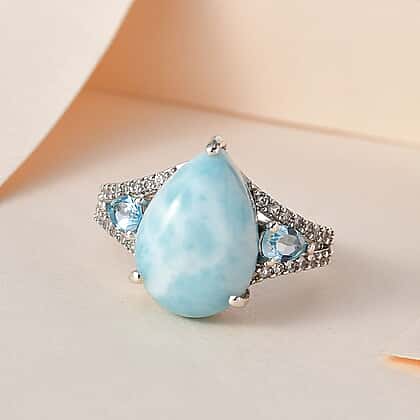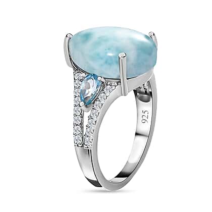 Larimar, Swiss Blue Topaz and Natural Zircon Ring in Platinum Overlay Sterling Silver 7.00 Ct.
