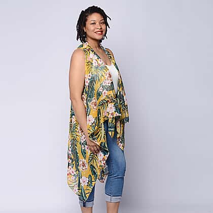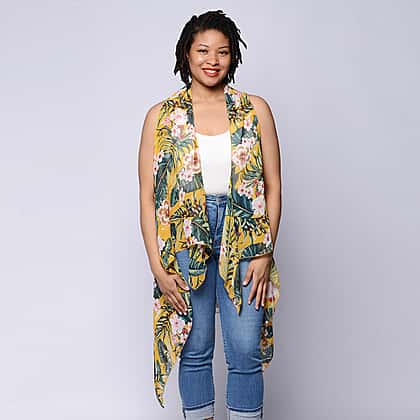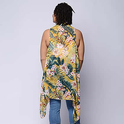 Leaf & Floral Print Sleeveless Kimono in Mustard and Green (Size 43x90cm)