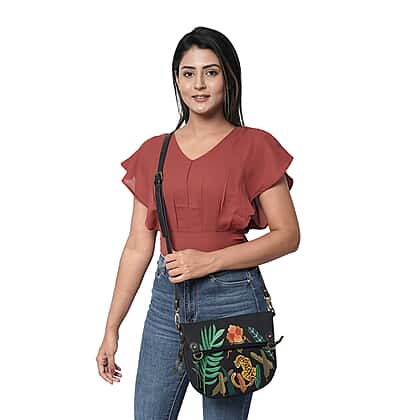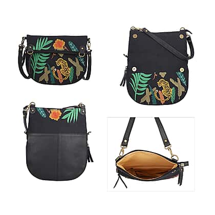 Leather and Canvas Leopard Embroidered Crossbody Bag with Adjustable Shoulder Strap - Black