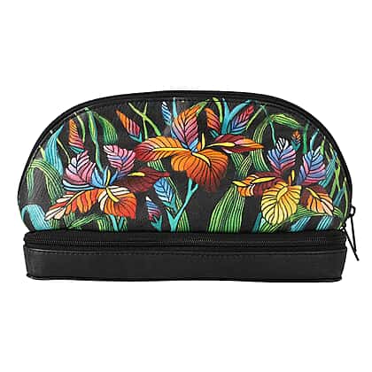 Leather Portable Hand Printed Lily Theme Jewellery Organiser (Size 20x15x8Cm) - Black