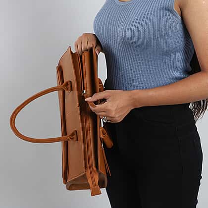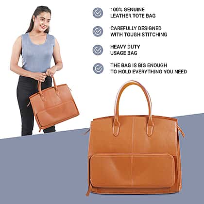 Leather Tote Bag with Detachable Shoulder Strap and Zipper Closure (Size 38x31x10 Cm) - Tan