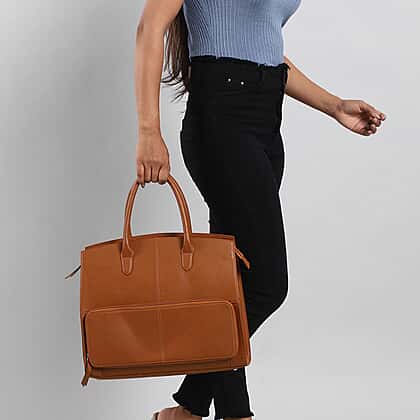 Leather Tote Bag with Detachable Shoulder Strap and Zipper Closure - Tan