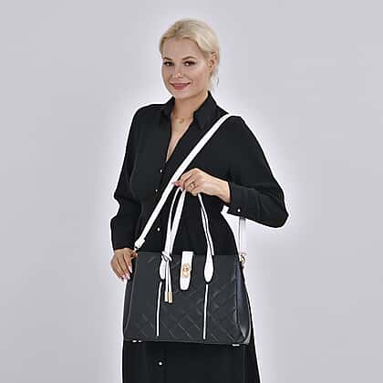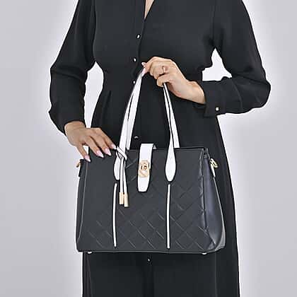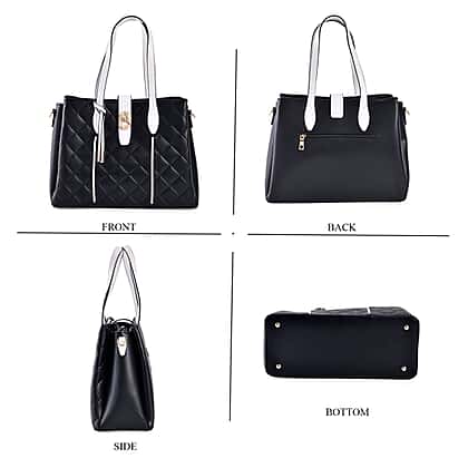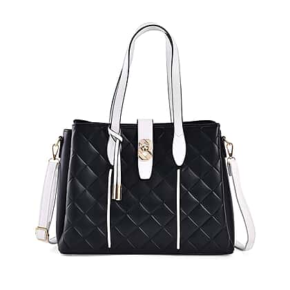 Leatherette Embossed Checker Pattern Crossbody Bag with Handle Drop - Adjustable Shoulder Strap - Black