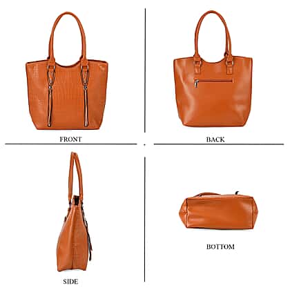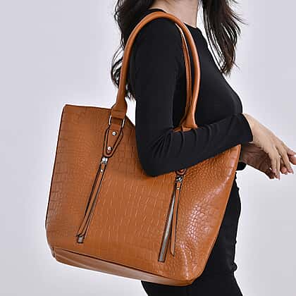 Leatherette Embossed Crocodile Pattern Tote Bag with Handle Drop - Brown