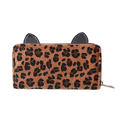 Leopard Print RFID Wallet with Decorative Cat Ears and Heart Nose - Brown