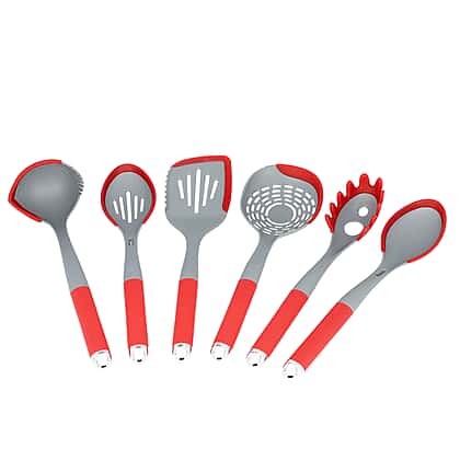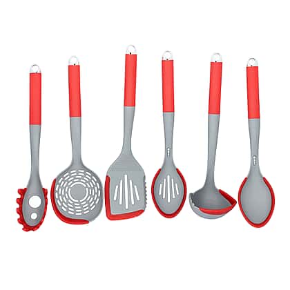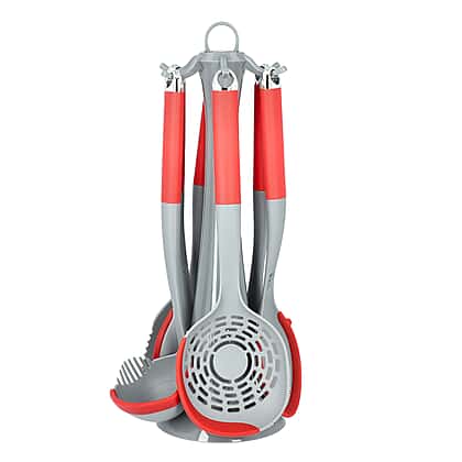 7 Piece Set - Kitchen Utensils (Includes Skimmer, Slotted Turner, Soup Ladle, Solid Spoon, Spaghetti Server, Slotted Spoon and Rotating Stand) - Red and Grey