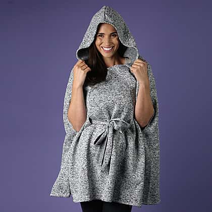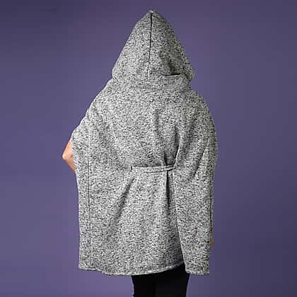 Hooded Neckline Knitted Poncho with Waist belt - Grey