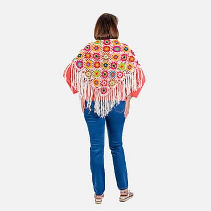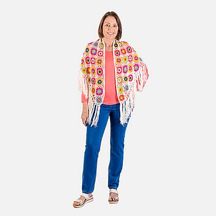 Limited Collection La Marey 100% Cotton Hand Crochet White, Green - Multi Colour Floral Shawl (160x86x18cm)