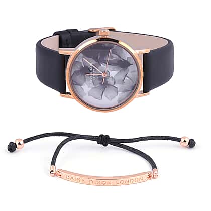 Limited Edition Daisy Dixon Sienna Adjustable Bracelet (Size 7.5) and Watch Set with Floral Black Dial in Rose Gold Tone