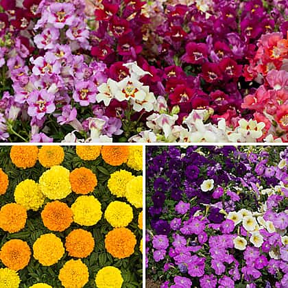 Bring vibrant colours to your garden with our 60 Plug Plant Collection of Wall Flowers, Marigolds, and Petunias. Antirrhinum Antiquity Mixed is a cottage garden favourite that produces a lovely mixture of pink, coral, red, and white flowers. Its beautifully scented compact and bushy growth habit makes it perfect for attracting bees and a great way to introduce kids to gardening. Marigold African Sun Mix is a superb performer, producing large pom-pom-like blooms in shades of gold, yellow, and orange, which are easy to grow in full sun or partial shade. Petunia's Frenzy' Mix brings your beds and baskets to life with its sumptuous, velvety flowers in fabulous red, pink, yellow, and purple shades. With regular feeding, watering, and deadheading, these undemanding plants will thrive in any soil, reaching a height and spread of 30cm (1ft). Order now and receive a pack of 60 pro+ plug plants, ready to grow before planting out.