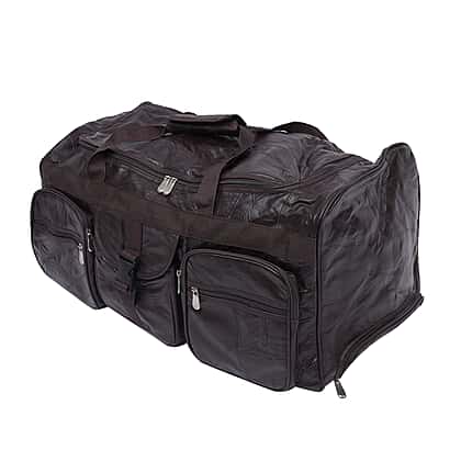 Travel in style with this genuine patch leather duffle bag. The leather bag comes in a classy washed-off brown colour. A leather finish enhances the looks of your bag. The main compartment has ample storage space for your travelling needs. Multiple side pockets ensure you never run out of space for storage while syncing with the style statement of the duffle bag. The trolley makes it easy to carry around.